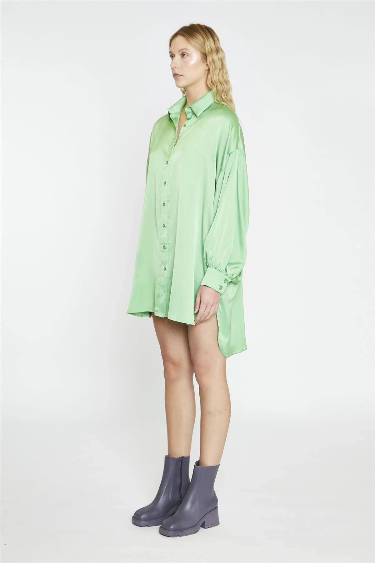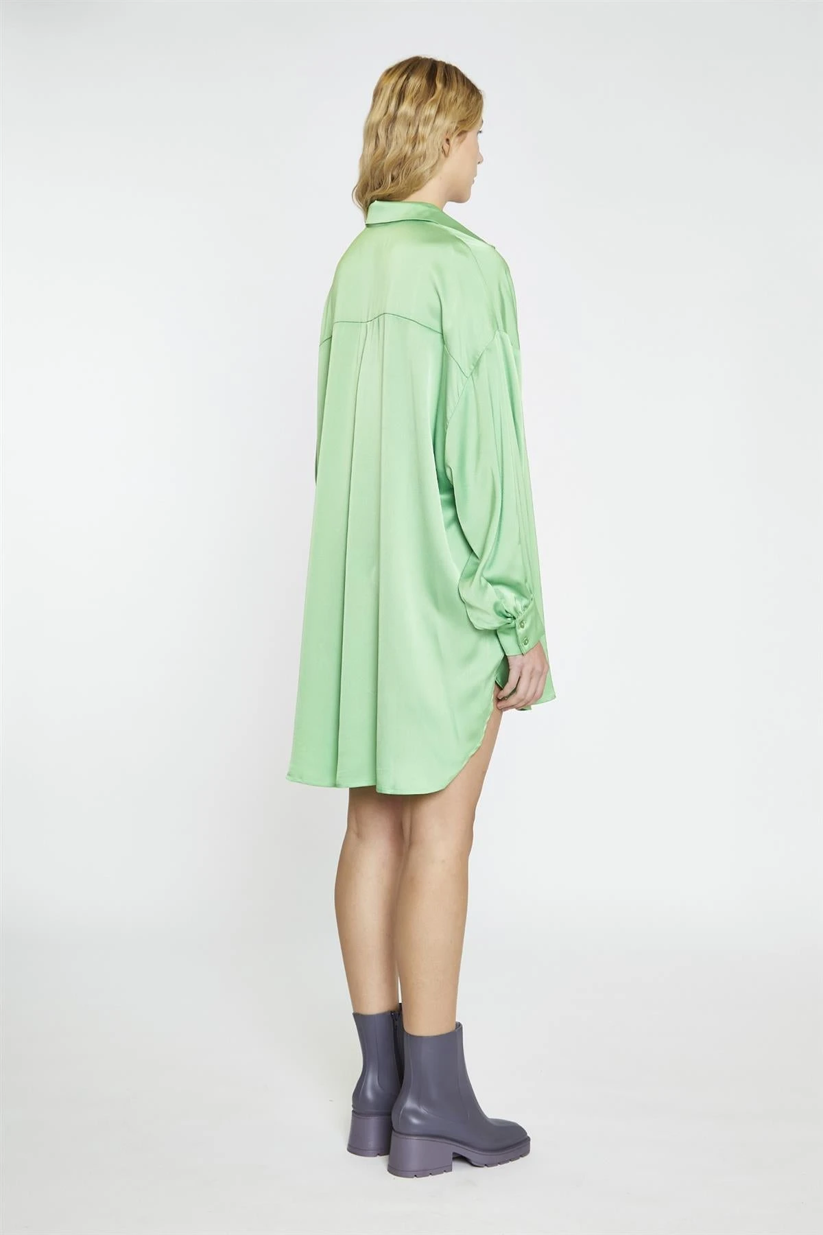 Glamorous Women’s Apple-Green-Sateen Shirt Oversized Mini-Dress. This oversized mini dress blends relaxed comfort with a playful touch through its high-low hemline, adding movement and interest to your look. The button-front design gives it a laid-back vibe, making it easy to adjust and style your way. Long sleeves offer coverage without feeling restrictive, so you can wear it comfortably throughout the day. The roomy fit creates an effortless silhouette that moves with you, while the sateen fabric adds a subtle sheen for a fresh and lively feel. It’s a versatile option that works well on its own or layered over tights or leggings when the weather calls for it.