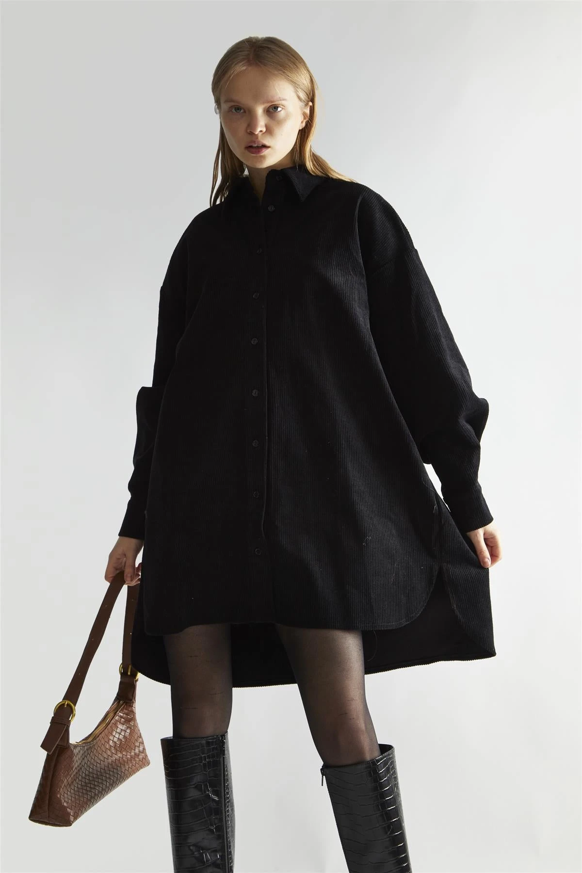 Glamorous Women’s Black-Corduroy Hi-Low Shirt-Dress. Meet your new favourite fall staple: the black corduroy mini-collared dress that’s as cozy as it is stylish. This charming piece brings together the best of comfort and fashion, with its soft corduroy fabric that’s perfect for cooler days. The mini length keeps things playful, while the collared design adds a touch of polish. Long sleeves offer warmth and versatility, making this dress a great choice for layering or wearing on its own. The plisse detailing adds a unique texture and movement to the dress, giving it a subtle flair that sets it apart from your average shirt dress. The hi-low hemline adds an interesting silhouette, providing a bit more coverage in the back while keeping the front short and sweet. It’s the kind of dress that works hard in your wardrobe – pair it with tights and boots for a cute autumn look, or throw on some sneakers for a more casual vibe. The black colour makes it easy to accessorize, so you can dress it up or down depending on your mood. This corduroy mini dress is like a warm hug for your style – comfortable, versatile, and undeniably chic.