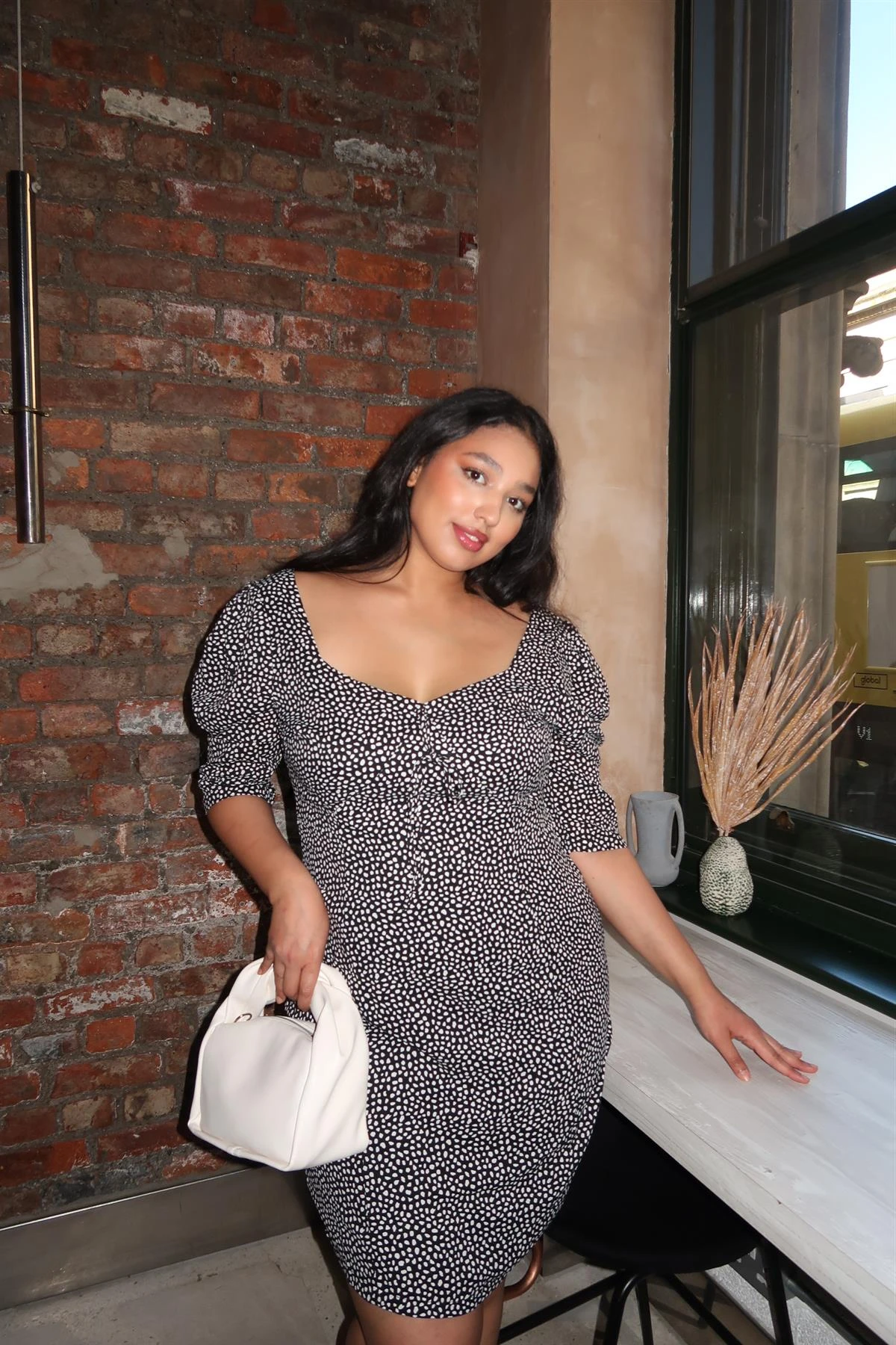 Glamorous Women’s Black Dalmatian-spot dress Midi-Dress. This black Dalmatian spot midi dress is designed to offer a fun, easy-going look that can be dressed up or down depending on the occasion. The playful spotted pattern brings a unique touch to this classic silhouette, while the V-neck adds a flattering shape to the neckline. With puff sleeves that give a soft, feminine feel, this dress strikes the perfect balance between relaxed and stylish. Fully lined for comfort and ease of wear, it’s a great option for everyday outings or weekend plans. Pair it with ankle boots or simple flats to complete the look for a casual yet polished vibe.