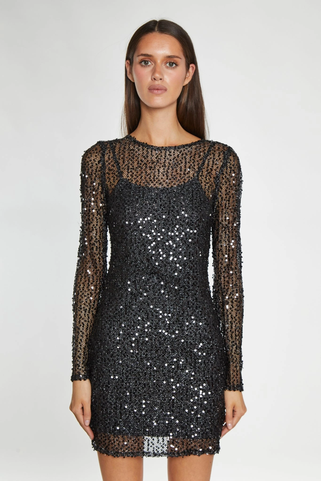 Glamorous Womens Black Sequin Mesh Mini-Dress. This dress will make you the shining star at your next event! Featuring long flared sleeves all in a sequin mesh fabric, this mini dress is a great piece for your party wardrobe. Pair with your highest heels for a stand out look!