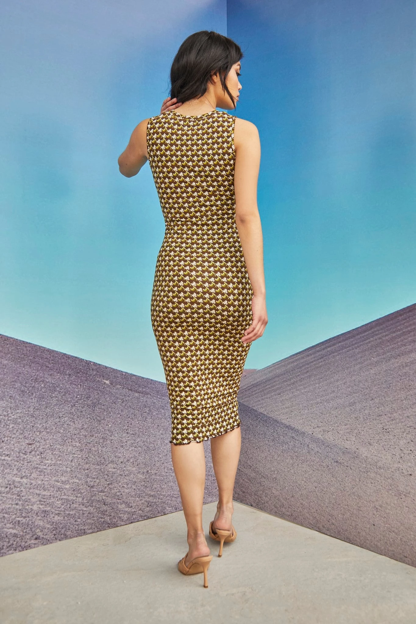 Glamorous Care Womens Khaki Hounds tooth High Neck Midi Dress. We cant get enough of this midi dress featuring a high neck and super on trend flattering fit. Join our positive journey towards reducing the impact that fashion has on our planet by styling this with some heels for the evening or trainers for the daytime for the perfect environmentally friendly look.