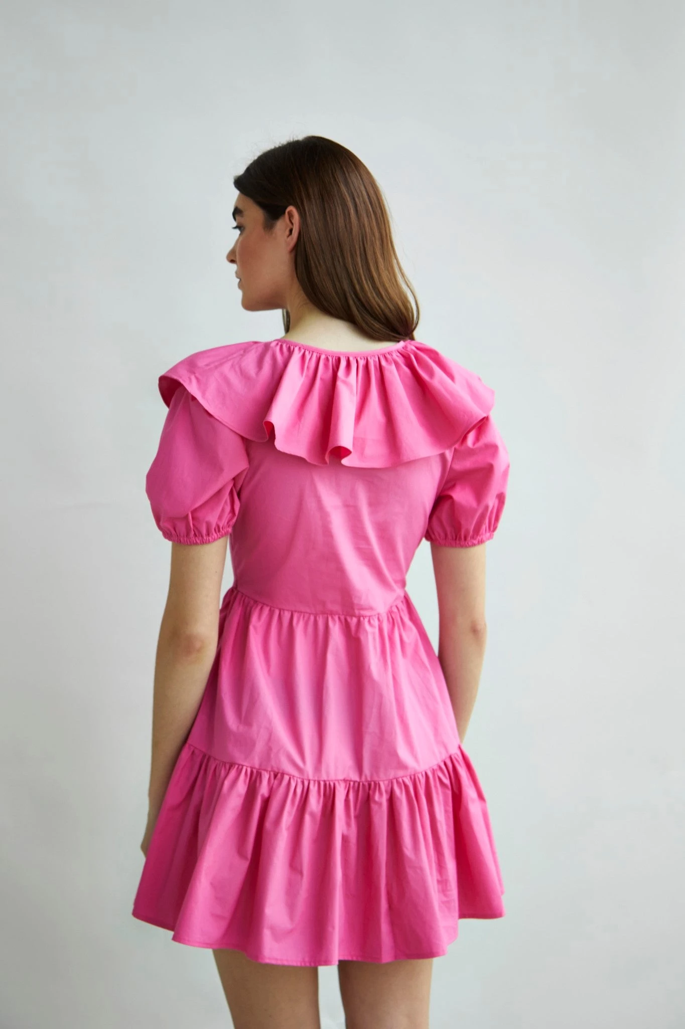 Glamorous Collection Hot Pink Puff Ruffle Mini Dress. Add a pop of colour to your wardrobe with this fresh hot pink mini dress. Featuring a statement ruffle neckline, puff sleeves, tiered skirt and loose smock fit, we love this piece here at Glamorous. Dress this gorgeous piece up or down with trainers or heels, its a must have for your Summer wardrobe.