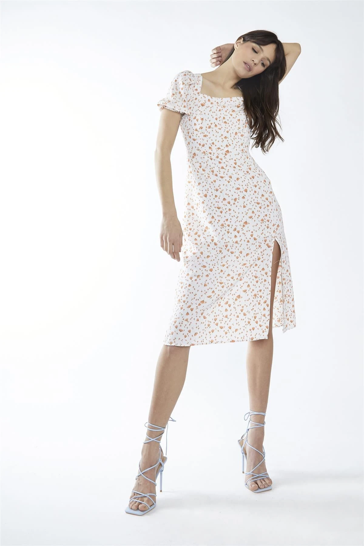 Glamorous Women’s Coral Tulip Ditsy Square-Neck Midi-Dress. This charming midi dress is a true summer dream come to life. The delicate tulip-ditsy print dances across the fabric, bringing a touch of nature’s beauty to your wardrobe. Its square neckline adds a modern twist to the classic silhouette, framing your décolletage beautifully. The short statement sleeves provide a perfect balance of coverage and style, making this dress suitable for various occasions. A daring leg split adds a flirty touch, allowing for easy movement and a subtle peek of skin. The tie-back detailing creates an adjustable fit and adds an extra element of interest to the overall design. This dress is perfect for garden parties, outdoor weddings, or romantic picnics in the park. The midi length offers versatility, looking equally stunning with flats or heels. It’s the kind of dress that makes you feel instantly pretty and put-together, radiating confidence and joy wherever you go. The floral print and feminine details make this piece a true wardrobe gem that you’ll treasure for seasons to come.