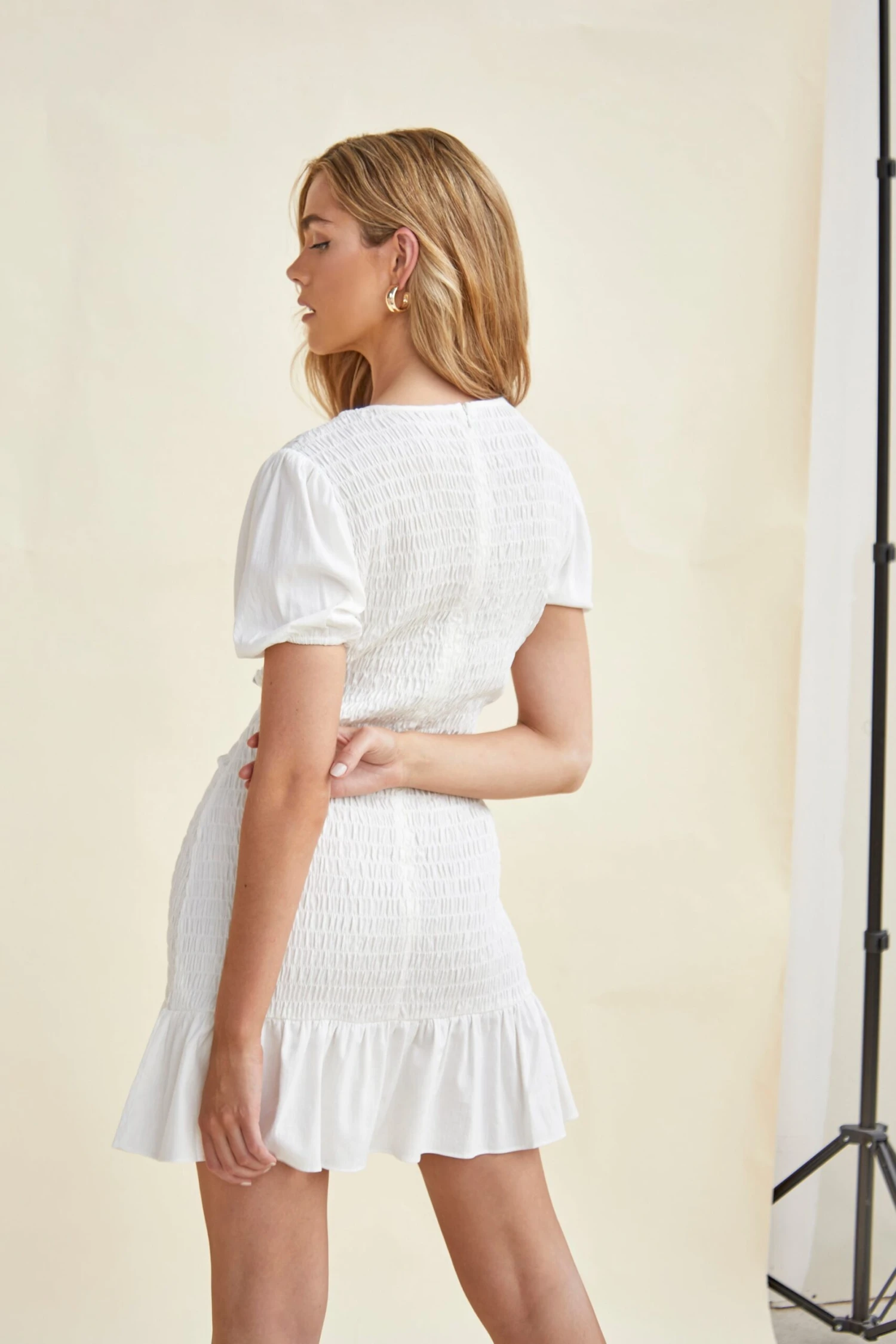 Glamorous Off-White Crew Neck Smocked Mini Dress. This super flattering crew neck mini dress is a must have staple piece this season. Featuring puff sleeves, a fully smocked body and fun ruffle hem. Dress this look up with your favourite heels.