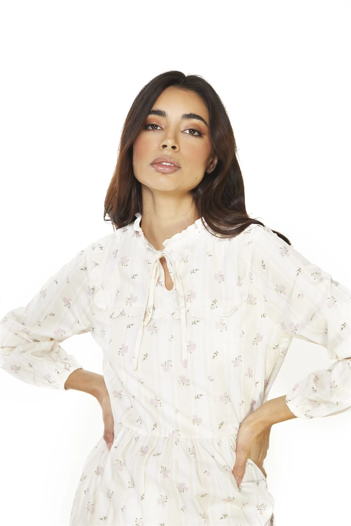 Glamorous women’s Ditsy Rose Stripe Long Sleeve Midi Dress. This stunning piece is destined for your wardrobe this Autumn season. Featuring a tie neck details and on trend pattern. Style this with some Chunky sandals or strappy heels for a chic fashion forward look.