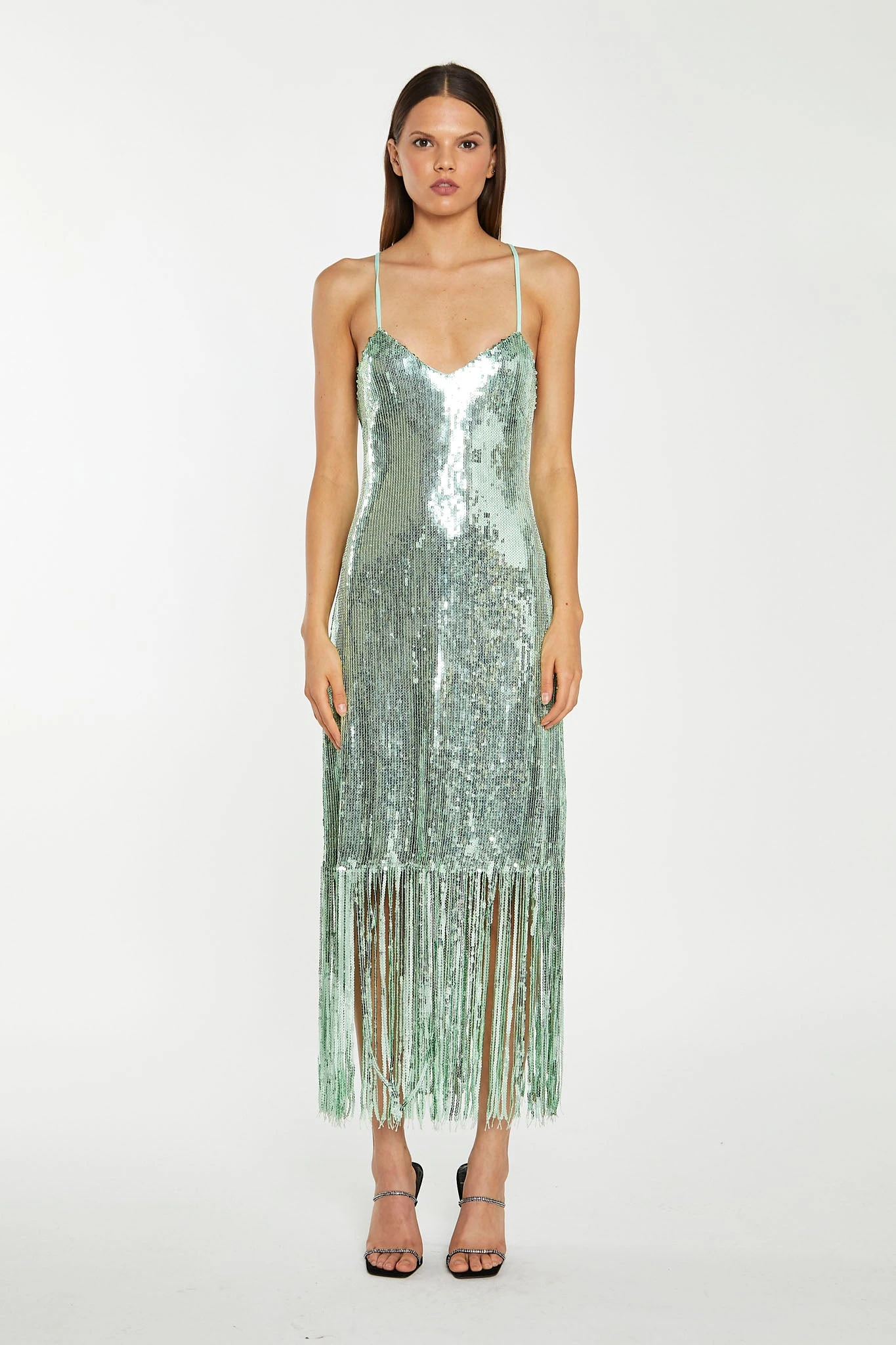 Glamorous Womens Jade-Sequin Cross Back Midi-Dress. This Cross Back Midi-Dress dazzles with its shimmery and on-trend sequin fabric. Make a statement with the tassel skirt detail and a criss-cross back design. The midi length and fully lined construction make it perfect for any occasion!