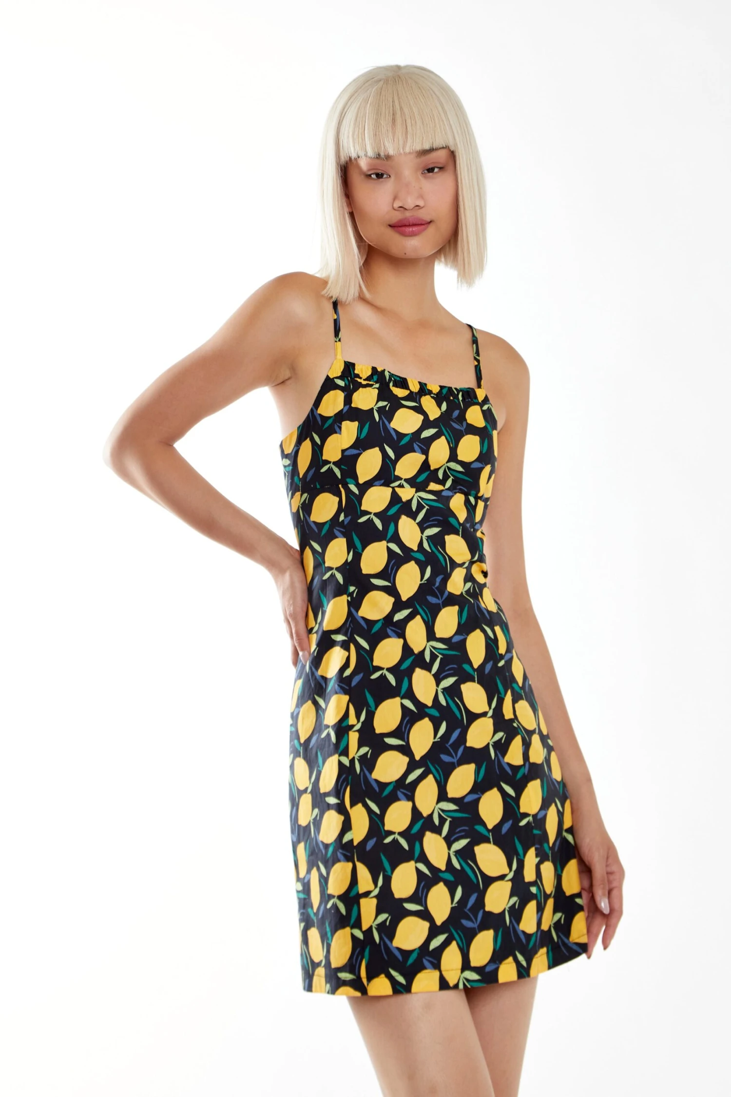 Glamorous Lemon Print Strappy Fitted Mini Dress. This mini dress is perfect for the upcoming summer season. Featuring a tailored fit, adjustable straps and on trend fruity print will have heads turning. Pair with chunky trainers for a effortlessly chic look.