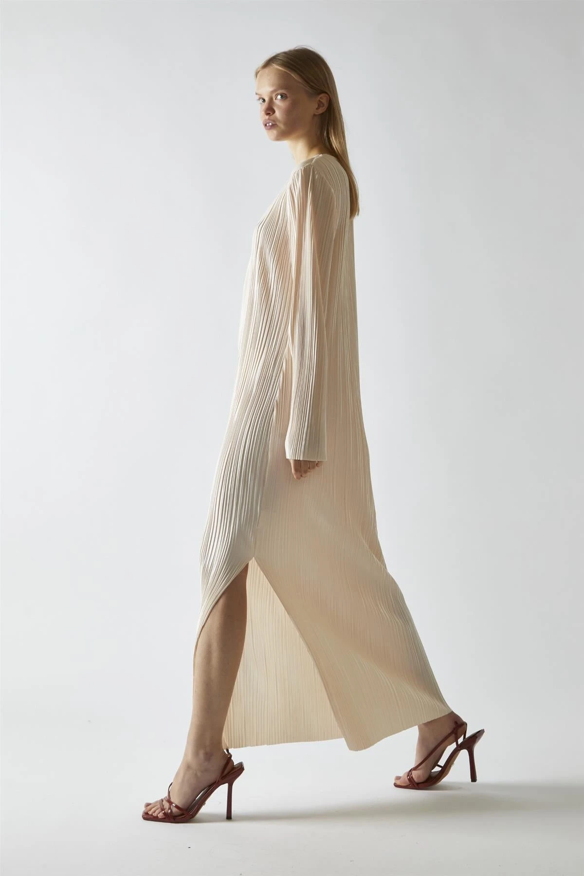 Glamorous Light-Apricot Plisse Midaxi-Dress. Float through your day in this dreamy light apricot plisse midaxi dress. The soft, peachy hue is a refreshing change from basic neutrals, adding a touch of warmth to your look. The plisse fabric gives the dress a beautiful texture and movement, creating an effortlessly elegant vibe. The midaxi length strikes the perfect balance between midi and maxi, offering a flattering silhouette that works for various heights. A daring leg split adds a flirty touch and allows for easy movement, perfect for twirling on the dance floor or strolling through farmers’ markets. This dress is a versatile piece that can be dressed up with heels and statement jewellery for special occasions, or kept casual with sandals and a denim jacket for brunch with friends. It’s comfortable enough for all-day wear but stylish enough to make you feel like you’re floating on a cloud of chic. This dress isn’t just clothing; it’s a mood lifter that’ll have you feeling pretty and confident with every step.