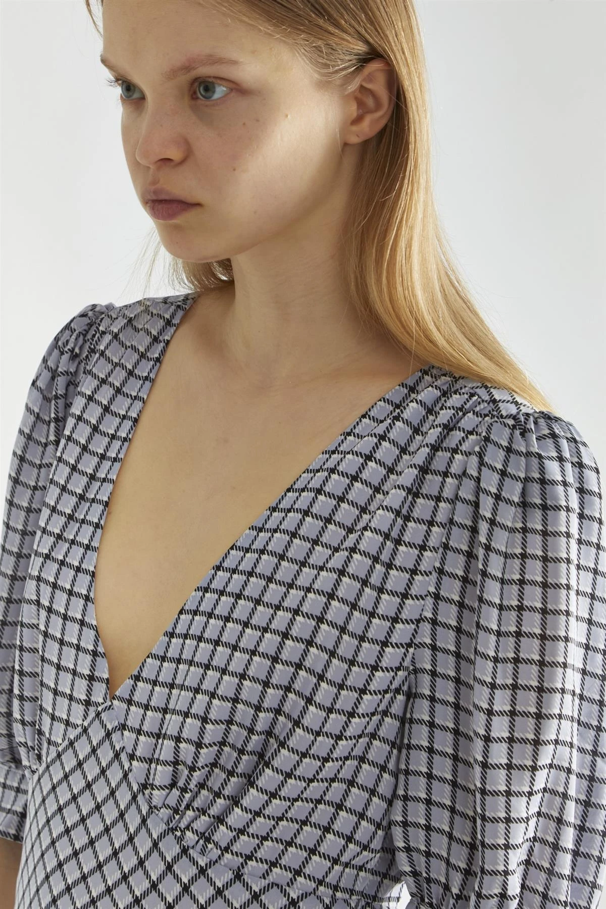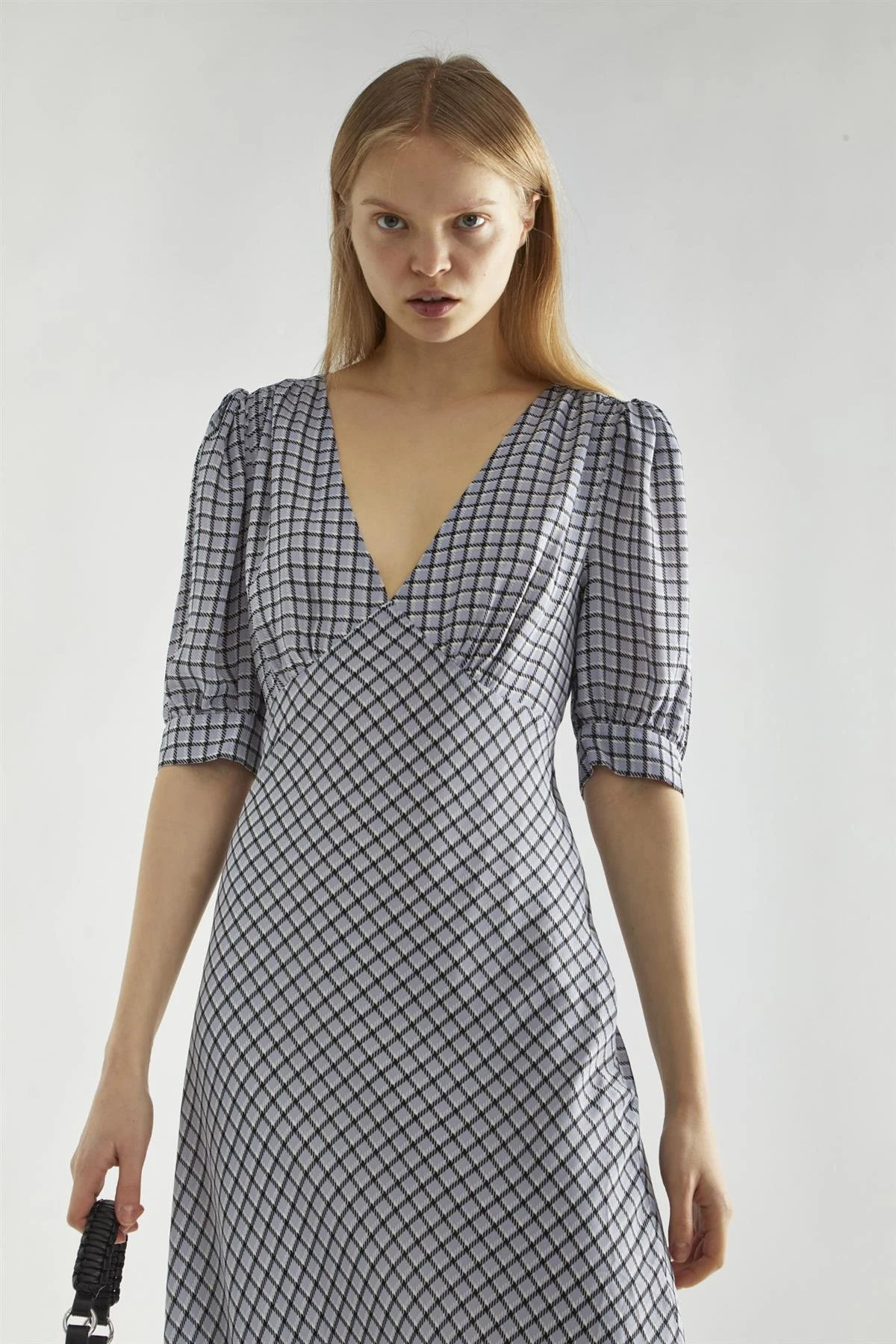 The Light-Blue Check V-Neck Midi Tea-Dress blends cozy charm with timeless elegance. Puff sleeves and a flowing tea-length silhouette add playful movement, while the V-neck frames the face beautifully. Add some frill socks and sandals to keep the look comfortable but confident.
