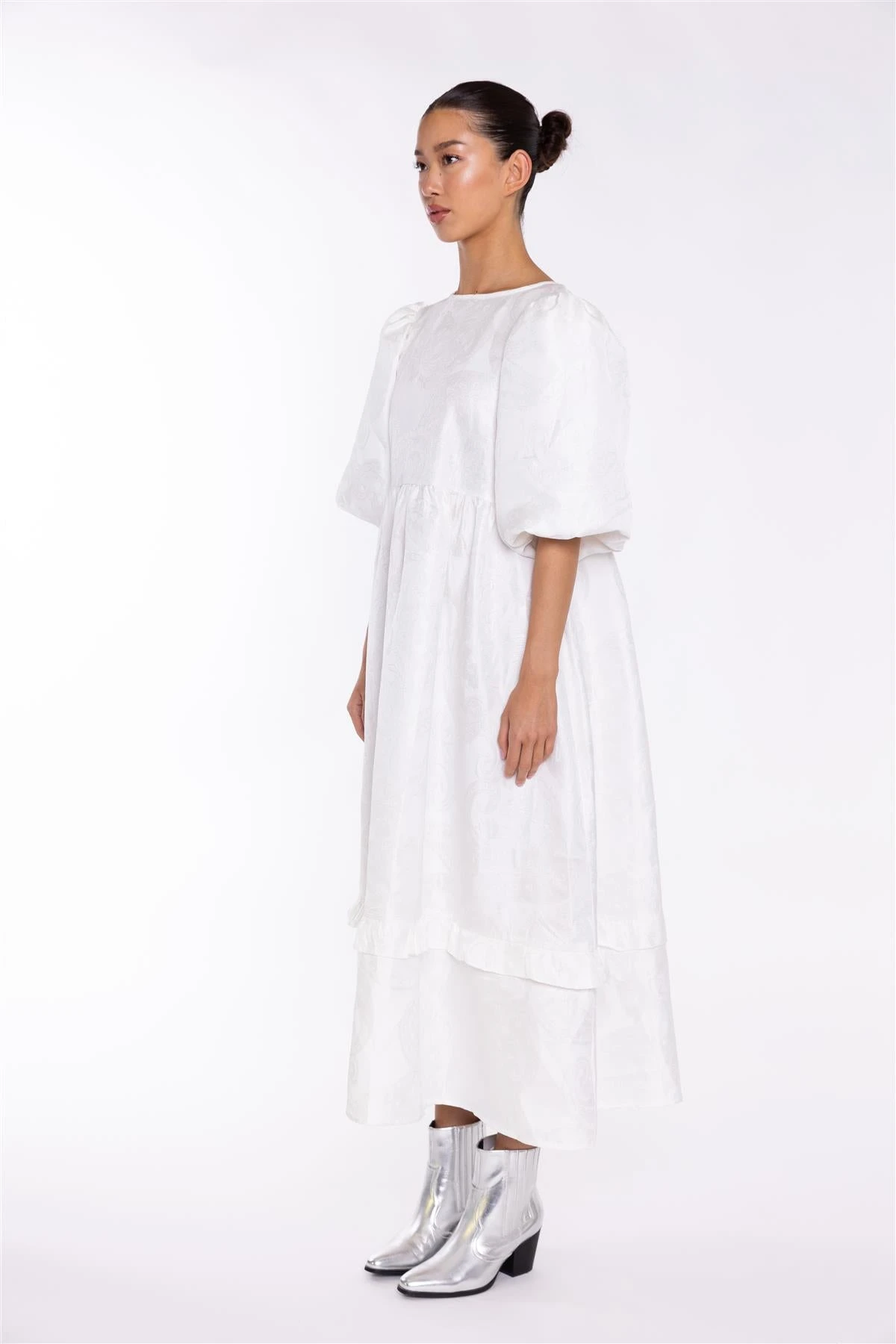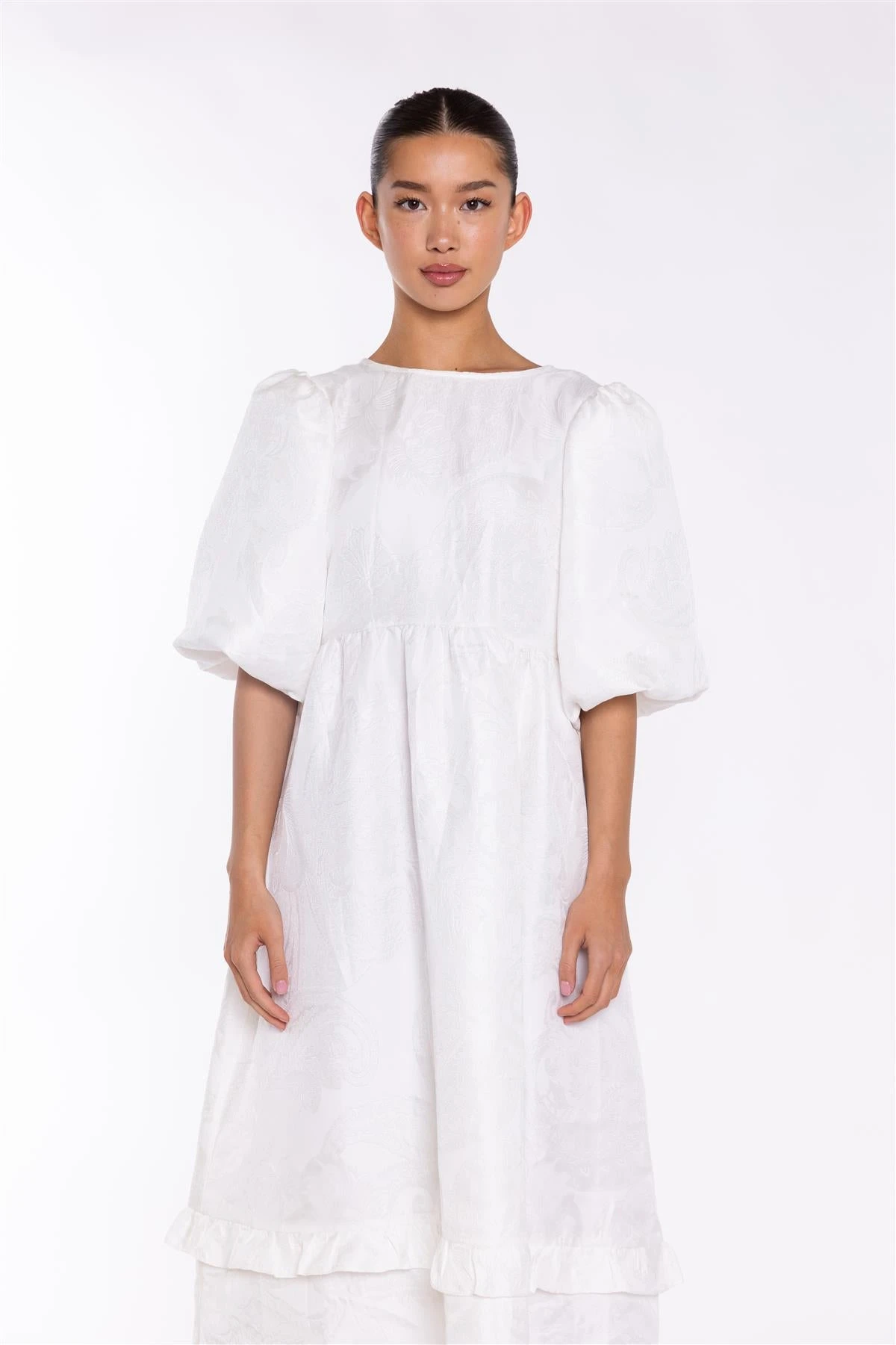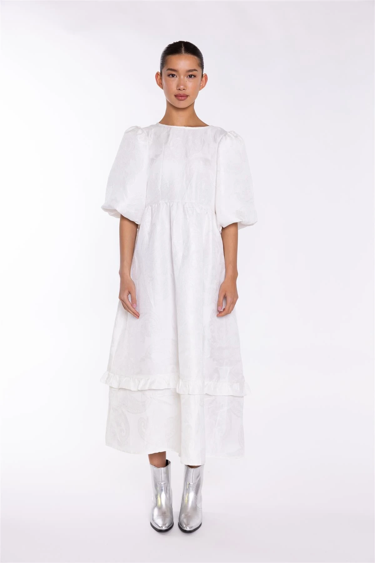 Glamorous Women’s Off-White Brocade Tiered Tie-Back Midi-Dress. Embrace your inner romantic in this off-white brocade midi dress. The brocade fabric adds a touch of luxe, with its intricate floral pattern and soft sheen. The puff sleeves create a whimsical, vintage-inspired look, while the tie-back detailing allows you to adjust the fit to your liking. The tiered skirt adds movement and volume, perfect for twirling on the dance floor or strolling through a garden party. The midi length is both elegant and comfortable, hitting at the perfect spot on your legs. And as always, this dress is fully lined for your peace of mind. Pair it with some strappy heels and a delicate necklace for a look that’s both timeless and on-trend. This dress is sure to become a go-to in your wardrobe, perfect for any occasion where you want to feel beautiful and confident..