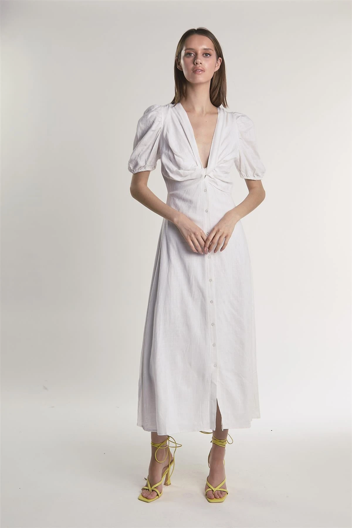 Glamorous Women’s Off-White Button-Front-Twist Midi-Dress. This midi dress brings together soft structure and subtle detail in a way that feels easygoing yet pulled together. The twist front adds a bit of texture without feeling overdone, while the plunging neckline keeps things light and open. Short puff sleeves bring a gentle volume that contrasts nicely with the fitted waist, and the button front gives it a nod to classic styling. A concealed zip at the back helps everything stay smooth and secure without fuss. The length works well for dressing up or down, and it’s one of those pieces that’s just as happy with sandals as it is with a heel. If you like a relaxed look with small, thoughtful touches—this one’s worth a try.