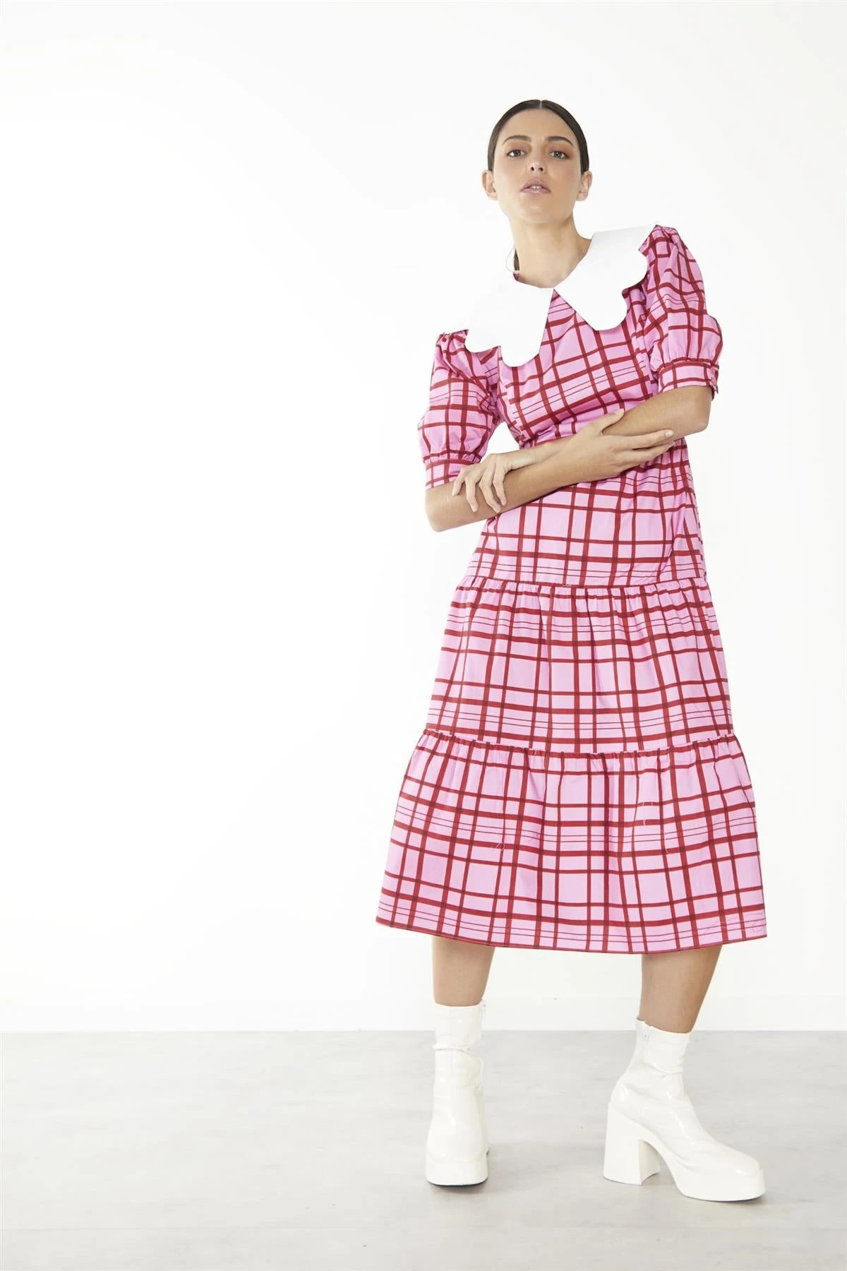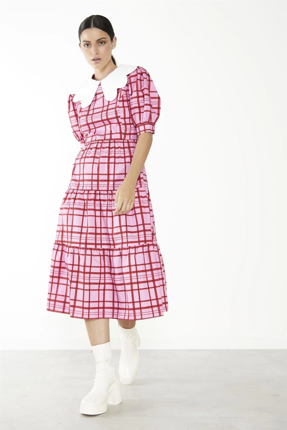 Glamorous Care Women’s Pink-Red Grid-Check Tiered Collared Midi-Dress. Embrace your inner romantic with this charming pink and red grid-check midi dress. Crafted from organic cotton, it’s a comfortable and eco-friendly choice that’s perfect for all-day wear. The oversized scalloped collar adds a playful, vintage-inspired touch, while the tiered skirt creates a flattering, flowing silhouette. The puff sleeves lend a touch of drama, balancing the midi length for a look that’s both feminine and fashion-forward. Whether you’re heading to the office or out for brunch with friends, this dress is sure to turn heads. Pair it with your favourite sneakers for a casual-cool vibe, or dress it up with heeled boots and delicate jewellery for a night out. The vibrant colour combination and classic check pattern make it a versatile piece that can be styled in countless ways. So why not add a little playfulness to your wardrobe with this charming midi dress?.