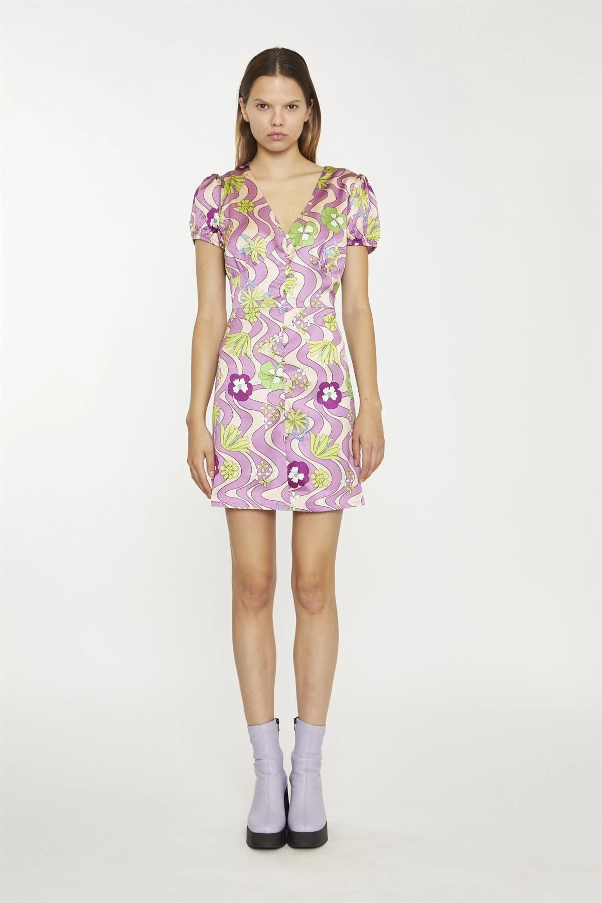 Glamorous Women’s Purple-Swirl-Floral V-Neck-Button-Up Mini-dress. Add a touch of bold elegance to your wardrobe with this purple swirl floral mini dress. The V-neckline creates a flattering frame for your neckline, while the button-up detail adds a classic yet playful touch to the design. With its bodycon fit, this dress hugs your curves in all the right places, giving you a confident and stylish silhouette. The vibrant swirl floral pattern brings energy and personality to your outfit, making it a standout choice for any occasion. Pair it with strappy heels and a clutch for an evening event, or dress it down with sneakers and a denim jacket for daytime outings. The mini length keeps things fresh and fun, while the comfortable fabric ensures you’ll feel great all day or night. This dress is all about blending bold prints with a sleek fit, making it an easy option for adding some flair to your wardrobe without overthinking your look.