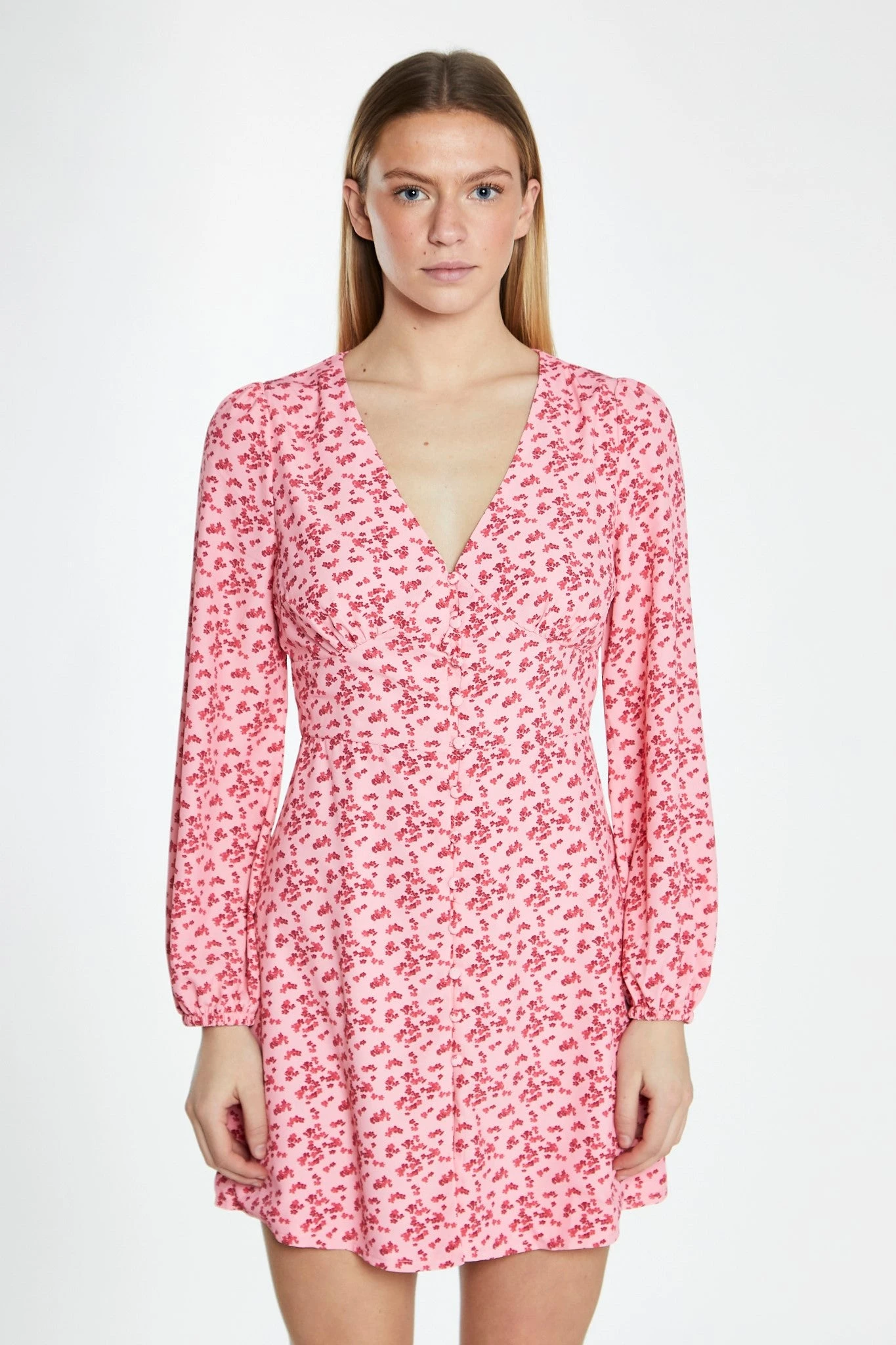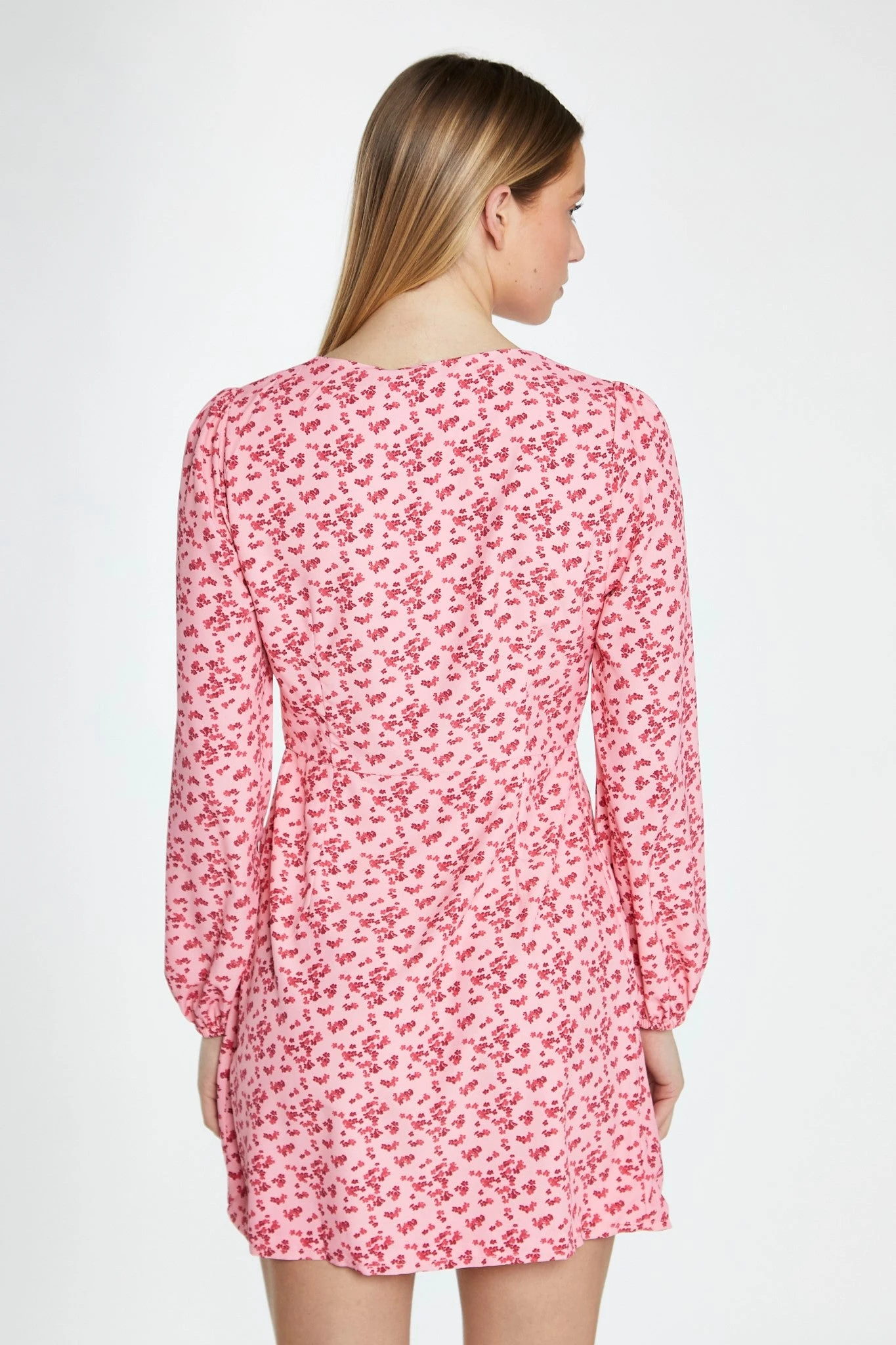 Glamorous Womens Raspberry Ditsy Button Front Long Sleeve Mini-Dress. This cute floral mini dress is perfect for any occasion. Featuring a V-neckline and long sleeves with button front detail, this piece will look great on you! Pair with some knee-high boots for an on-trend look this Spring.