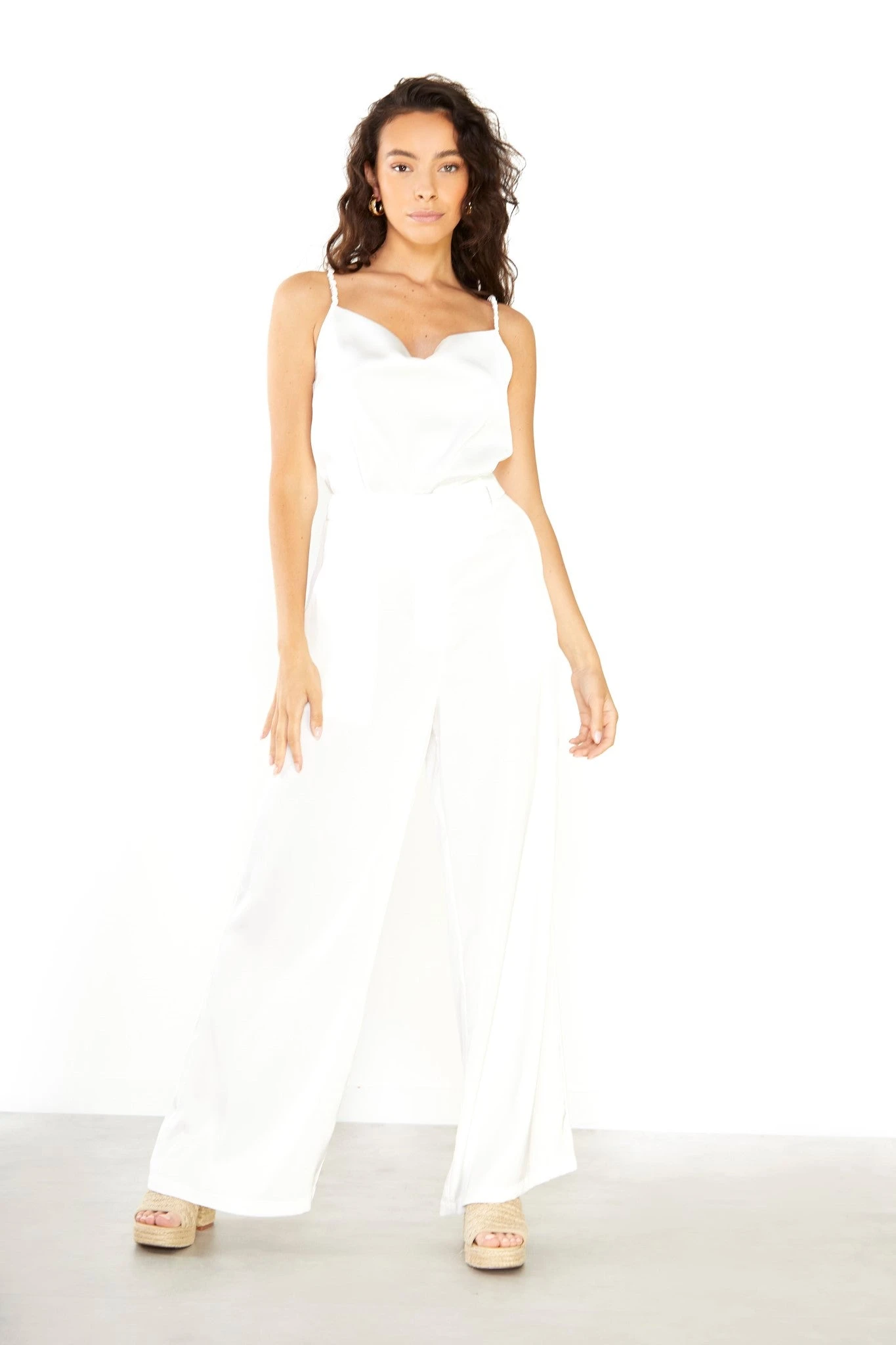 Glamorous Studio White Satin Cowl Neck Cami Top. This staple piece is a must have for your summer wardrobe. Featuring a cowl neckline, and ruched strap details. we love this piece here at Glamorous. Pair with sleek trousers and a strappy heel for an effortless luxe look.