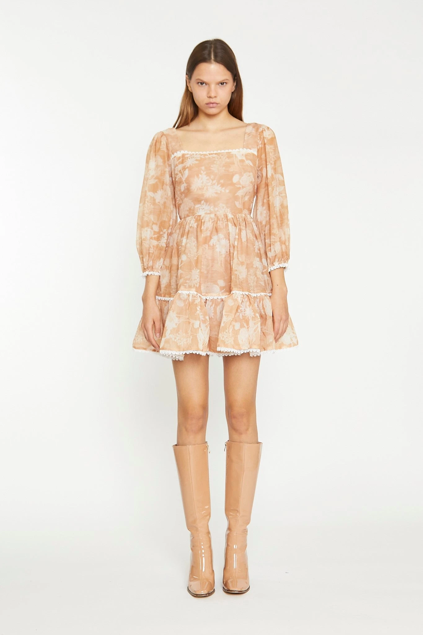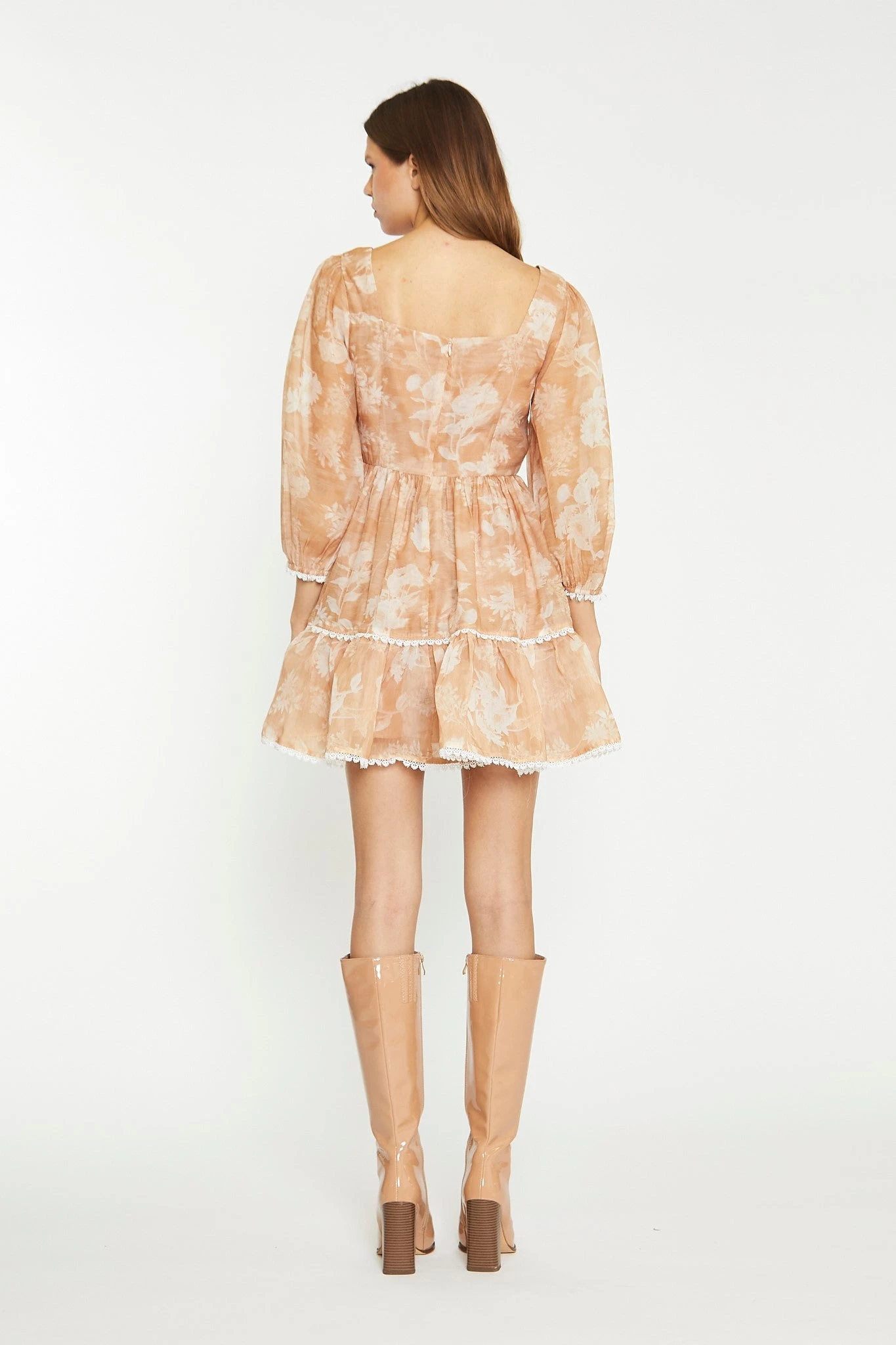 Glamorous Womens Tan White Floral Tiered Mini-Dress. This gorgeous mini dress will look great on you! Featuring a tiered design, square neckline and balloon sleeves with a lace trim in a vintage inspired floral print, this dress wont fail to impress. Pair with some knee-high boots for the perfect daytime outing this Spring.