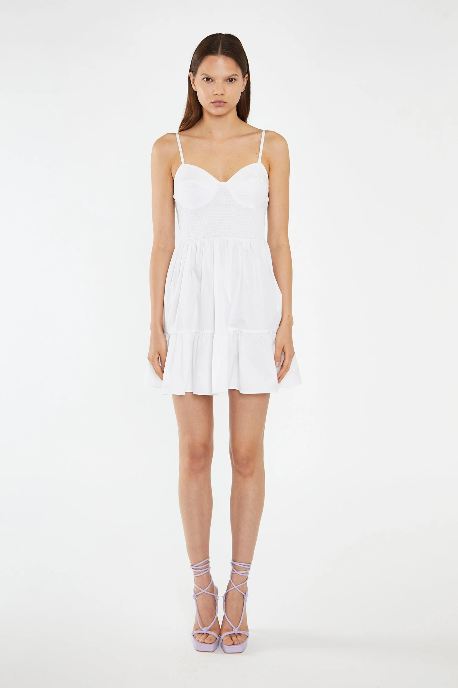 Glamorous Women’s White Tiered Smocked-Bodice Mini-Dress. This white mini-dress features a delicate shirred bodice with bust cup details, adding a touch of elegance to its playful design. The gathered tiered skirt and adjustable spaghetti straps create a flattering silhouette, while the mini length adds a flirty and fun element. Perfect for any occasion, this dress is a must-have for your wardrobe!