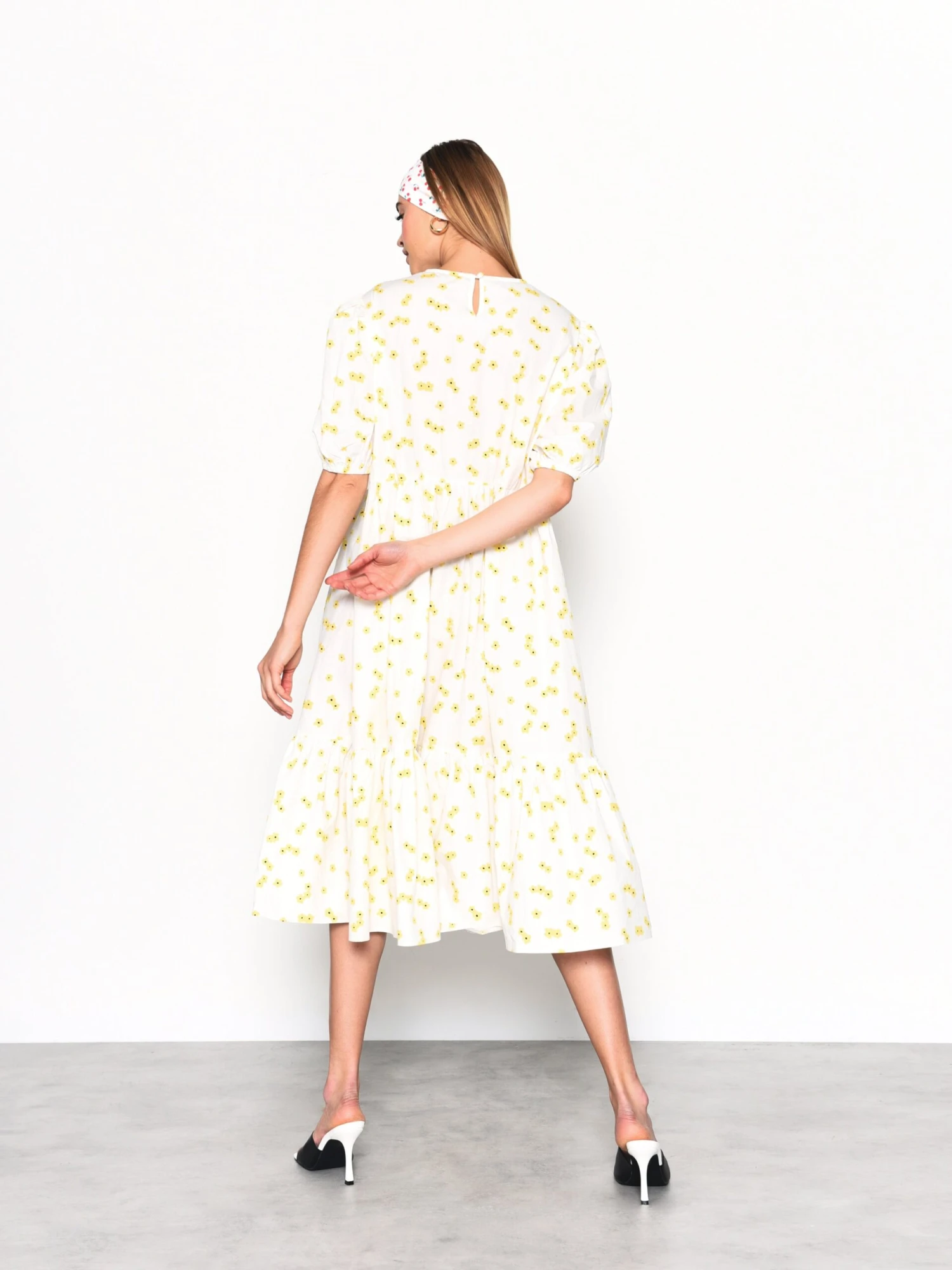 Glamorous Womens White Yellow Flower Midi Dress. This Midi dresses is a must have for your wardrobe this season! Ticking all of this seasons trend boxes, we just cant get enough of the playful yellow floral ditsy print, volume sleeves and ruched detail. Fun yet elegant, this luxe dress will take you from brunch to bar. Simply swap trainers for heels to take your look from day to night.