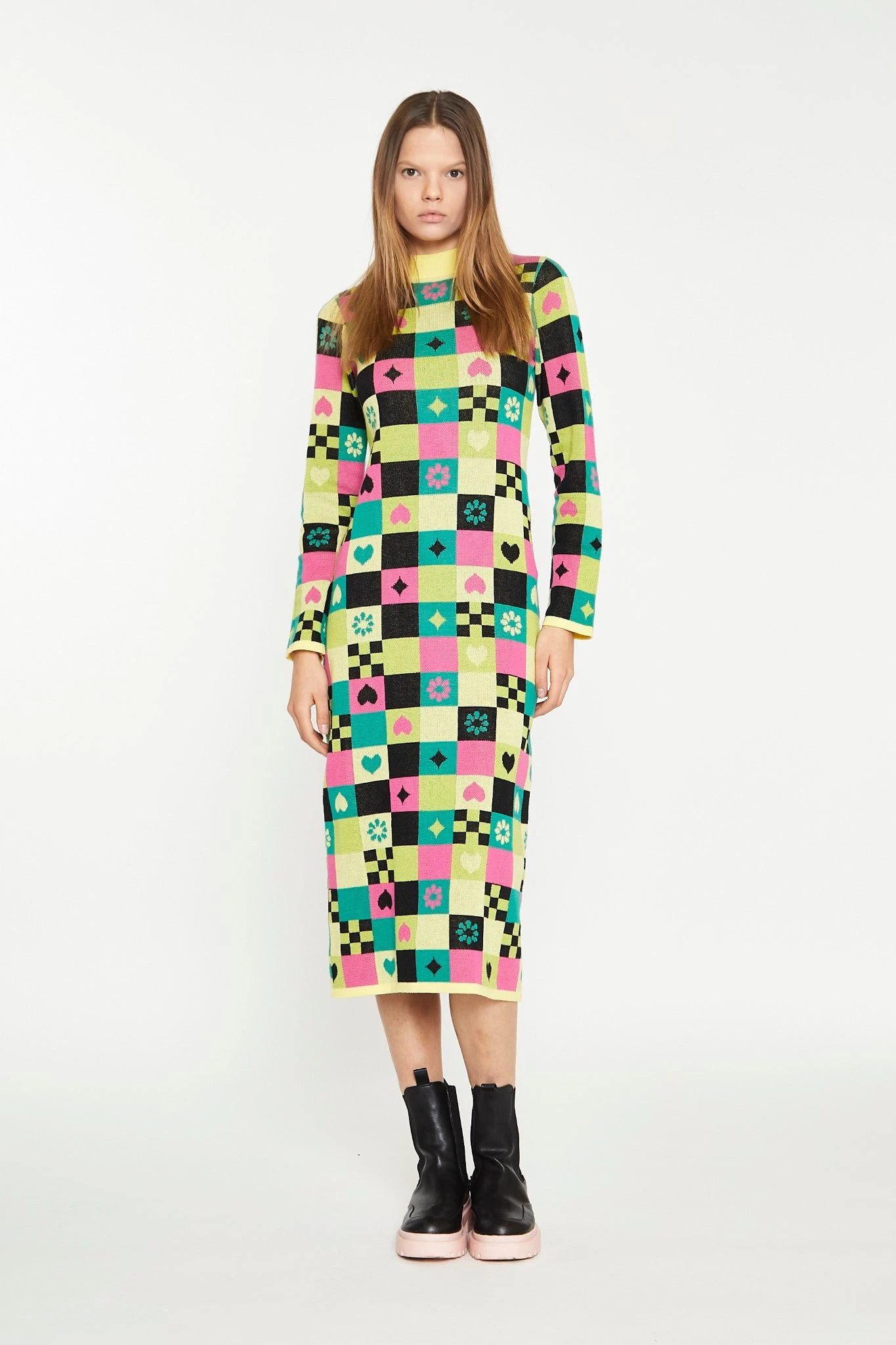 Glamorous Womens Yellow Green Multi Tile Knitted Midi Dress. We cant get enough of this colourful knit midi dress. Featuring long sleeves and high neck, this really is a head turning piece. Look great teamed with chunky boots for brunch dates.