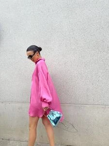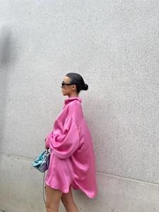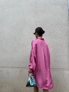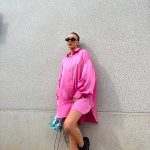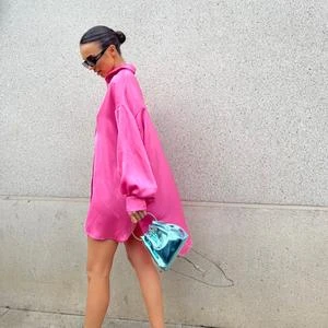 Glamorous Women’s Pink Sateen Oversized Mini Shirt-Dress. This classic shirt dress in a refreshing pink sateen fabric is destined for your wardrobe this season. Featuring button front detail with long sleeves and a flattering oversized relaxed fit, this mini dress will look great on you! Pair with some chunky loafers for the perfect daytime outing this season.